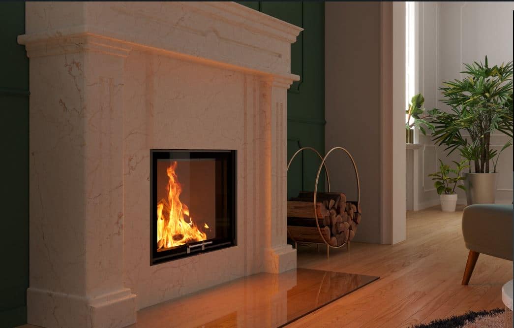 Wkład kominkowy Spartherm Mini Sh z drzwiami podnoszonymi do góry oraz blenda wykończeniową.